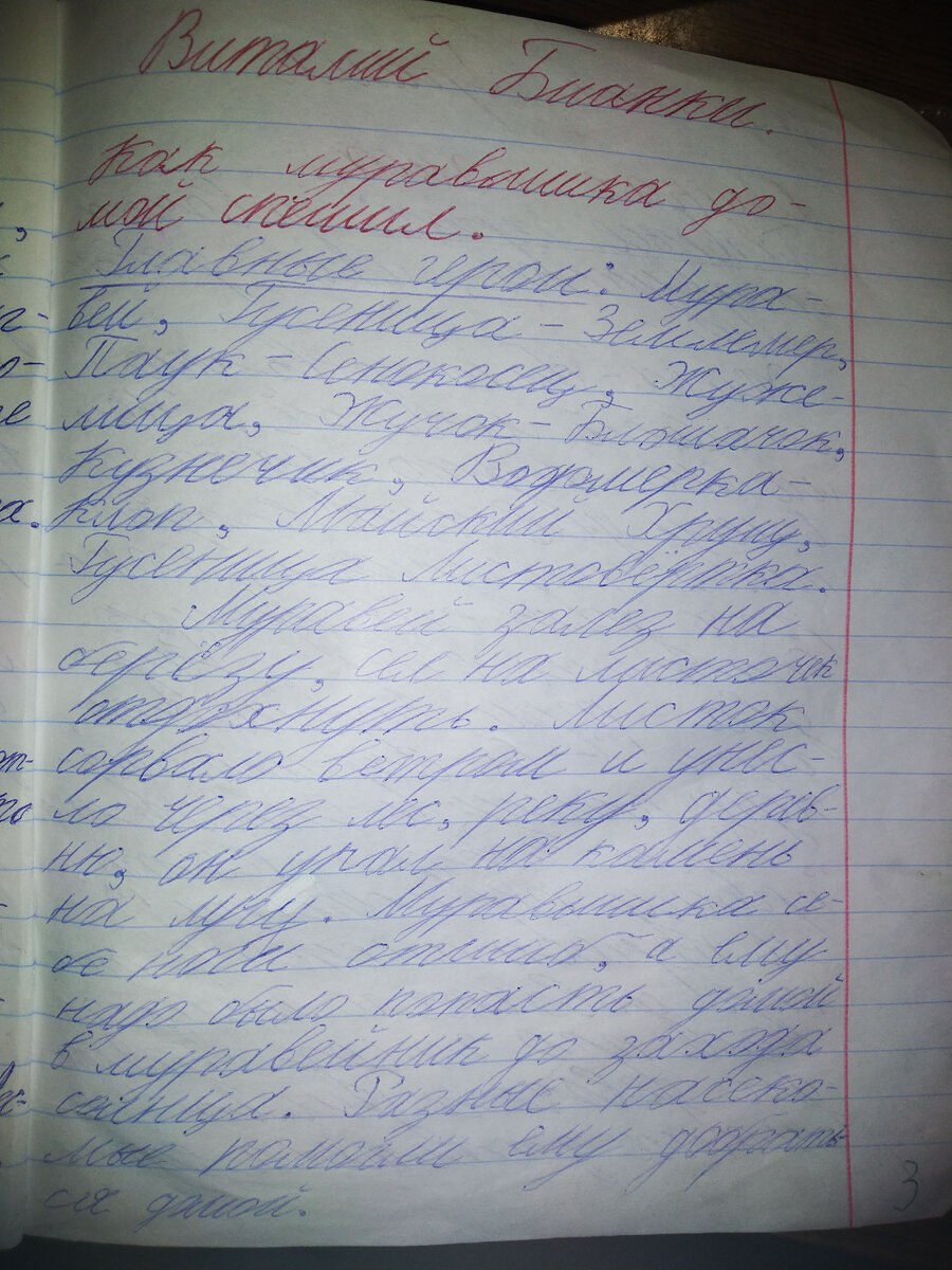 Герои: Муравей, Гусеница-Землемер, Паук-Сенокосец, Жужелица, Жучок-Блошачок, Кузнечик, Водомерка-Клоп, Майский Хрущ, Гусеница Листовёртка. Муравей залез на берёзу, сел на листочек отдохнуть. Листок сорвало ветром и унесло через лес, реку, деревню, он упал на камень на лугу. Муравьишка себе ноги отшиб. а ему надо было попасть домой в муравейник до захода солнца. Разные насекомые помогли ему добраться домой.
