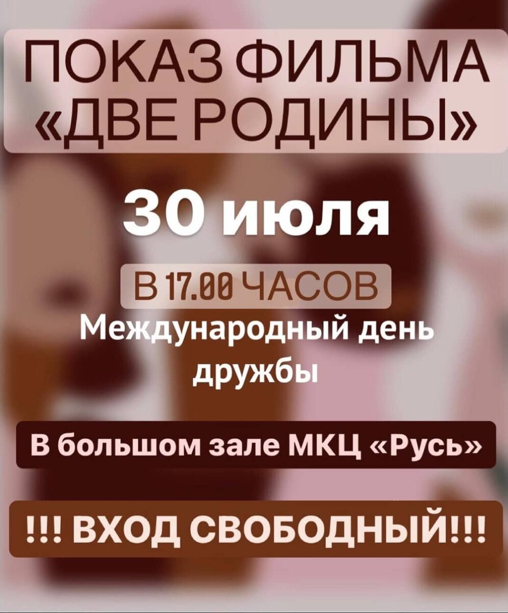 30 июля в Международный день дружбы 🤝кинотеатр "Русь" покажет для вас фильм «Две родины». Начало в 17 часов!!!ВХОД СВОБОДНЫЙ!!!~~~~~~~~Фильм о людях, родившихся в СССР, у которых после распада Советского Союза оказалось две Родины - Россия и Казахстан.