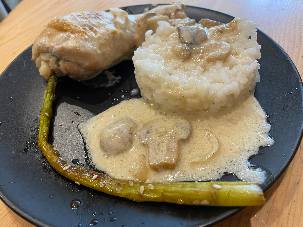 Рецепт этого блюда мы взяли с канала oblomoff, но внесли свои адаптации: вместо куриных бёдер использовали ножки, а вместо муки - кукурузный крахмал. Вышло очень вкусно! Нам потребуется: Обжариваем по очереди грибы и лук и откладываем в тарелку. Протерев насухо сковородку, выкладываем куриные ножки. Пусть обжариваются без масла до появления корочки. Жира, вытопившегося из этих частей курицы будет достаточно для того, чтобы они не пригорели и не прилипли к сковородке. Подготовленные ножки также откладываем в отдельную тарелку. Насыпаем в сковородку кукурузный крахмал и выливаем стакан воды, лучше горячей. Перемешиваем до загустения. Добавляем сметану, раскрошенный бульонный кубик и перемешиваем. Следом отправляем грибы с луком, нарезанный чеснок, при необходимости добавляем еще воды. Так было указано в оригинальном рецепте, я не добавляла. По желанию можно сыпануть любимых специй. Перемешиваем и прогреваем 3-5 минут. И наконец добавляем обжаренные куриные ножки, поливаем соусом и тушим