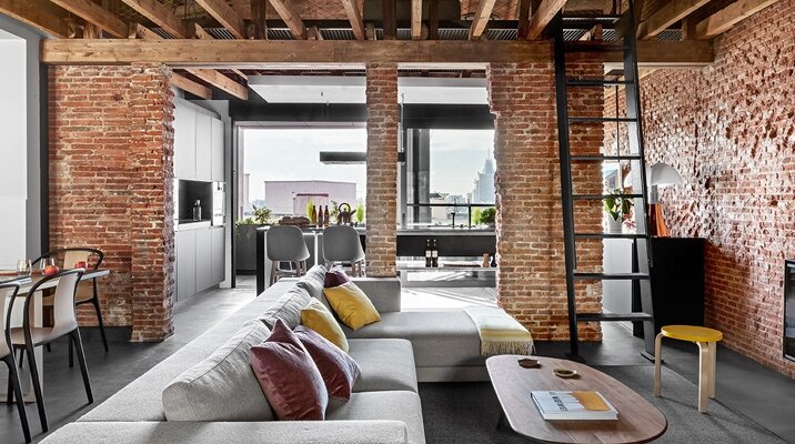 Спальня в стиле "Лофт" может быть оформлена бамбуком двух оттенков. В таком интерьере стены будут иметь не только полезный косметический эффект, но и станут приятным элементом декора.