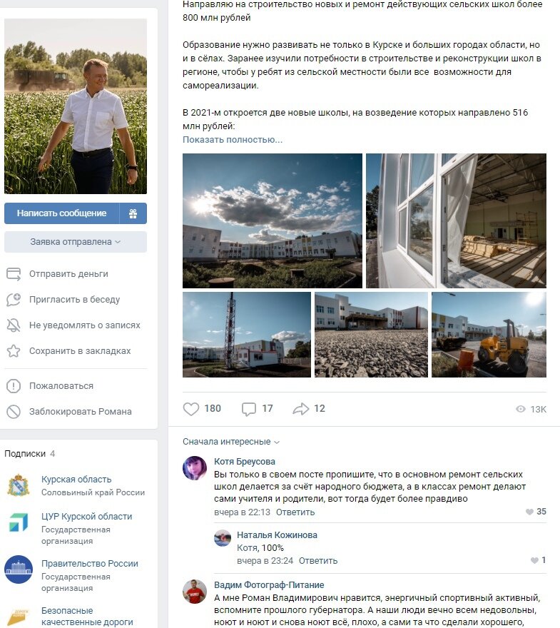Во-вторых, комментарием сторонника губернатора, который выделил из всех заслуг губернатора: энергичность, спортивность, активность. И всё! Посмотрел аккаунт этого человека, чтобы понимать целевую аудиторию, которая поддерживает Романа Старовойта и увидел человека, продвигающего Гербалайф. Гербалайф и работа Романа Старовойта в Курске - возможно что-то в этом есть...