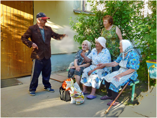 Представьте: обычный летний вечер, тихий дворик, окруженный с четырех сторон четырехэтажными домами, построенными еще во времена Хрущева, у подъездов палисаднички, засаженные цветами, и лавочки. У одного из подъездов собрались бабульки на вечерние посиделки, сидят, дружат против кого-то.