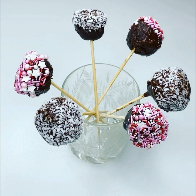 Кейк-попсыДумала,выкладыватьэтовидеоилинет,таккакпервыйблинкомом,новсежерешилавыложитьирассказатьобошибках,которыедопустила! Нампонадобится: Длябисквита: 2яйца 60г.сахара 40г.муки 20г.какао 1пакетикразрыхлителя Яйцассахаромвзбитьдобелойпены,книмдобавитьостальныеингредиенты.Всеперемешать,выпекать10мин.приt180*C Сгущеноемолоко~120г.,новысмотритепосвоемубисквиту,зависитотеговлажности!Возможно,сгущенкипонадобитьсячутьбольшеилименьше! Важно,чтобышарикихорошолепились,какпластилининесползалисошпажек! Послетого,каксмешалибисквитсосгущенкойискаталишарики,нанизываемихнашпажкииубираемвморозилкуминутна30,чтобыонинемногозатвердели.Втакомвидеудобнопереворачиватьиокунатьвшоколадипосыпку. Длязаливки: 2шоколадкирастопитьнаводянойбанеиливмикроволновкенарежимеразморозка,носледите,чтобышоколаднезакипелинекристаллизовался! Окунаемшарикисначалаврастопленныйшоколад,азатемчередуем-вкондитерскуюпосыпкукокосовуюстружку! Обязательносделайтетакоелакомстводлясвоихдеток,ониготовыэтоесть,лучшелюбоготорта!