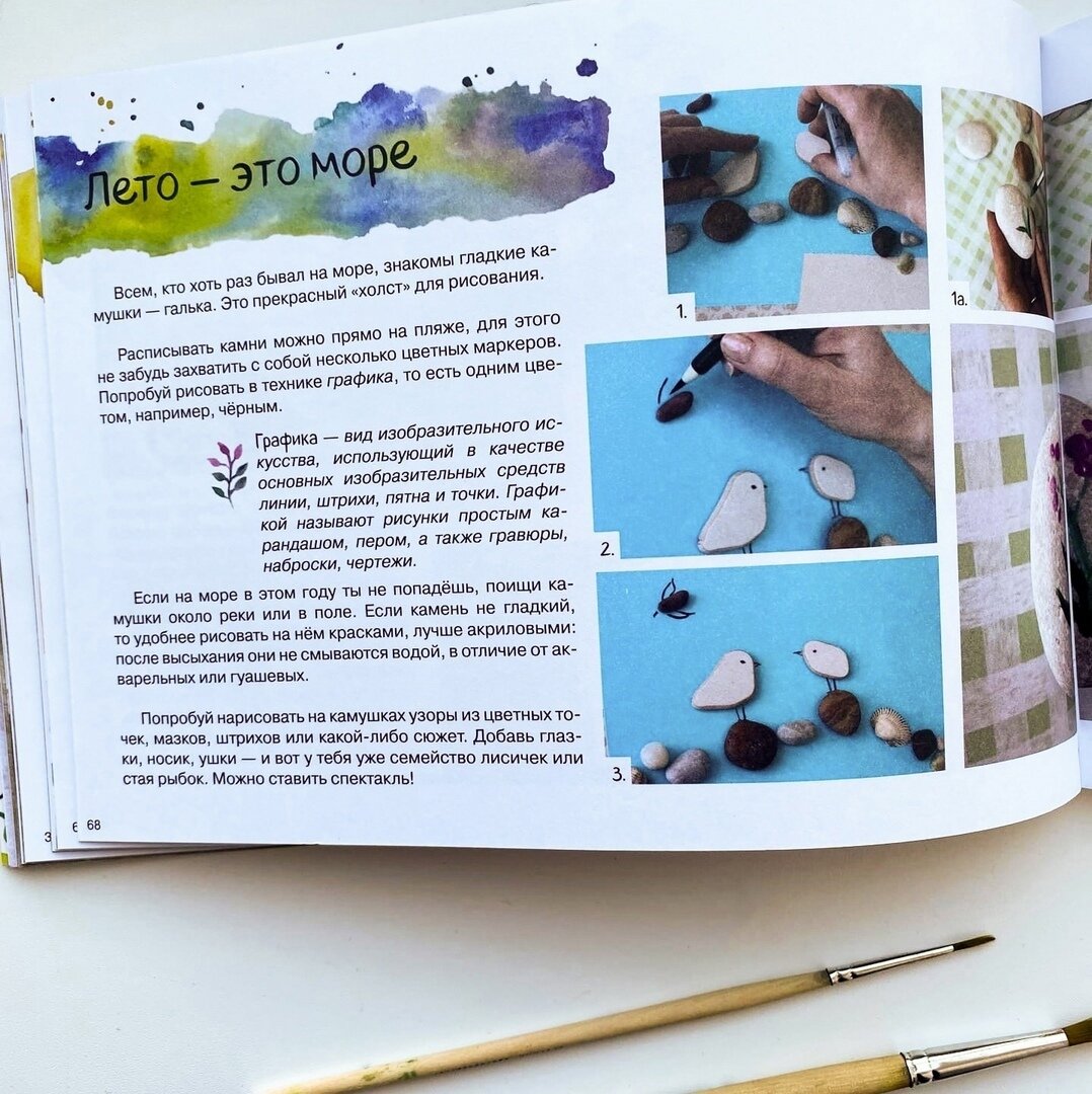 Лето – пора каникул и путешествий. Многие семьи в этом году уже отправились или только собираются с детьми на море. И взрослым, и детям обязательно захочется сохранить воспоминания о тёплых летних днях на морском побережье, и в этом вам поможет творчество! Автор «Летнего альбома», предназначенного для творчества детей, а иногда и их взрослых родителей, Юлия Савенкова создала отличный пошаговый мастер-класс для малышей, испытывающих неуёмную тягу к творчеству и интерес к природе. Мастер-класс: Лето – это море Всем, кто хоть раз бывал на море, знакомы гладкие камушки – галька. Это прекрасный «холст» для рисования. Расписывать камни можно прямо на пляже, для этого не забудьте захватить с собой несколько цветных маркеров. Попробуйте рисовать в технике графика, то есть одним цветом, например, чёрным. Если на море в этом году вы не попадаете, поищите камушки около реки или в поле. Если камень не гладкий, то удобнее рисовать на нём красками, лучше акриловыми: после высыхания они не смываются
