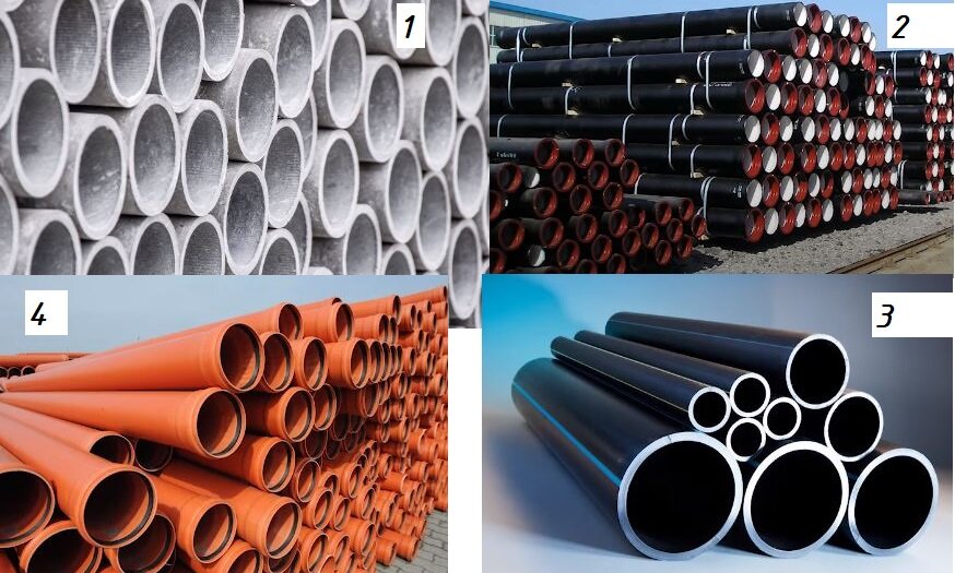 Очень много разновидностей канализационных труб, которые ко всему прочему еще и выполнены из разных материалов! Рассмотрим один из наиболее популярных канализационных труб для индивидуального жилищного строительства - речь про трубы ПВХ (на картинке под номером 4). Эти трубы обычно бывают в двух цветах: