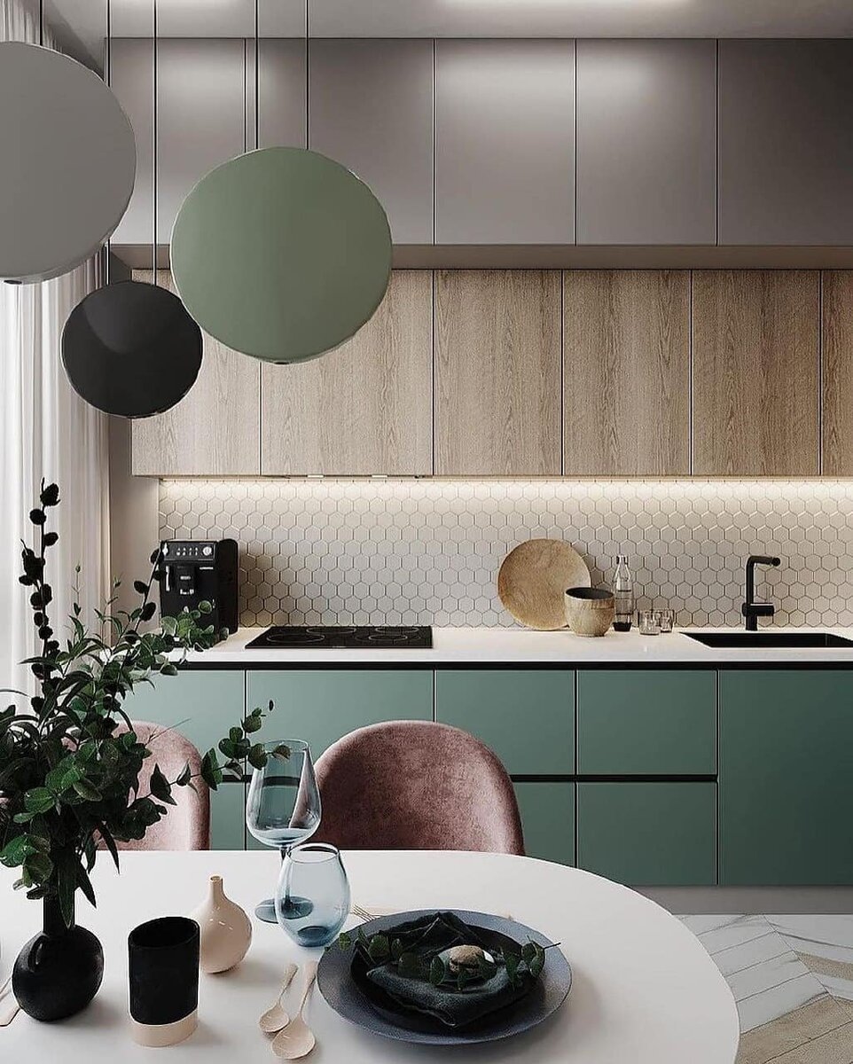 Нежно мятные матовые напольные шкафы, двухуровневые навесные шкафы в потолок, выполненные из двух стилей и цветов.