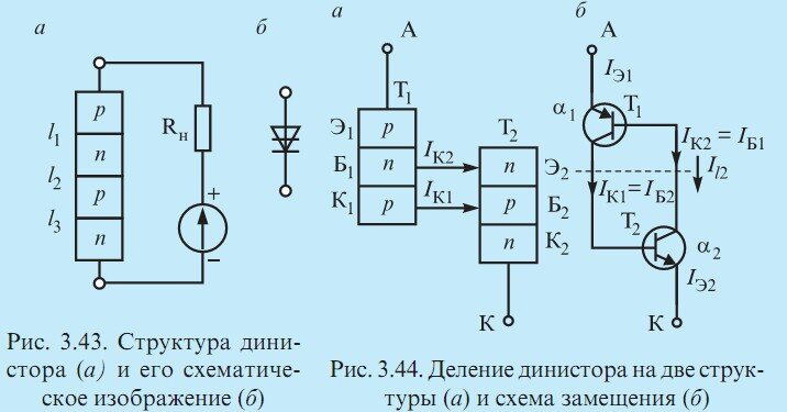 Динистор — это двухэлектродный прибор диодного типа, имеющий три p-n перехода. Крайняя область pназывается анодом. Другая крайняя область n — катодом. Структура динистора приведена на рис. 3.43. Схему замещения динистора можно представить в виде двух триодных структур, соединённых между собой. Деление динистора на составляющие транзисторы и схема замещения приведены на рис. 3.44. При таком соединении коллекторный ток первого транзистора является током базы второго, а коллекторный ток второго транзистора — током базы первого. Благодаря этому внутреннему соединению внутри прибора есть положительная обратная связь.