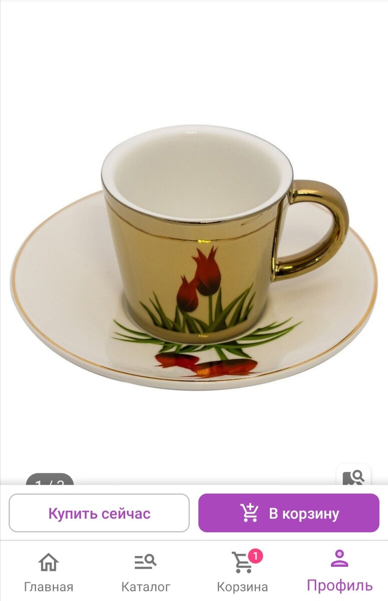 Купила на сайте Wildberries кофейную пару за 247 рублей рублей. Посмотрим, что мне привезли. Вот так кофейная пара смотрится на сайте. Положительных отзывов очень много, но есть и отрицательные. Кому-то пришло разбитое блюдце, где-то была недостаточно зеркальная поверхность. Цена пары была невысокая, пара мне очень понравилась на картинке, потому решила её заказать. Доставили вот в такой коробке. Открываю... Первой показалась чашка. Достаю. Вот такая золотая малышка. Повертела её. Никаких сколов, трещин, неровностей. Смотрим дальше. За чашкой в коробке оказалось блюдце. На донышке название фирмы-производителя. Вот так пара выглядит отдельно. На чашке нет никакого рисунка. Вот так пара смотрится вместе. Рисунок на блюдце отражается в зеркальной поверхности чашечки. Вот в этом и фокус. Пара мне понравилась, она не тяжелая (но и не невесомая), об'ем 90 мл. Внешне очень симпатичная. Посмотрим, как пара будет вести себя дальше 🙂. Будет ли она надёжной, прочной в эксплуатации.