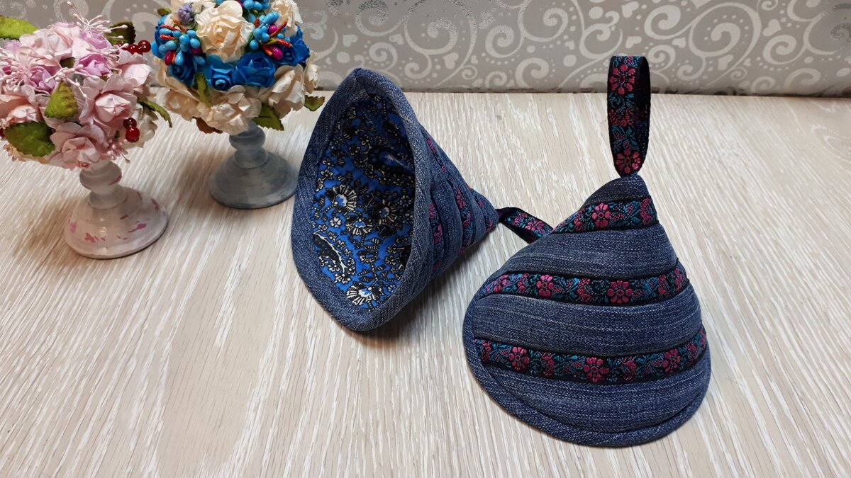 Сколько бы прихваток я не шила, они у меня не задерживаются, ведь совсем недавно сшила новые прихватки из джинсовых карманов, все ушли к подруге, сшила новые - в виде колокольчика, тоже ушли, даже часа не прожили на моей кухне! Остались у меня небольшие остаточки ткани от джинсы, бязи и флиса, выбросить конечно же не смогла, а это значит надо куда нибудь их приспособить, решила сделать прихватки - колокольчики, они такие удобные, шила их уже не один раз, решила заменить старенькие на новенькие, но видать не судьба - опять их у меня увели, из под самого носа)))))))) Но если кто-то захочет их повторить, то покажу, как их шила. Для пары прихваток - вырезала по два полукруга из джинсы, бязи и флиса, размером 24 см на 12 см. Простегала эти три слоя с помощью декоративной тесьмы, шириной 1 см, получились такие интересные спиральки на прихватках, главное еще не забыть сделать петельку, чтобы за что подвешивать колокольчики))))) Окантовку края сделала из джинсовой косой бейки, для этого вырез