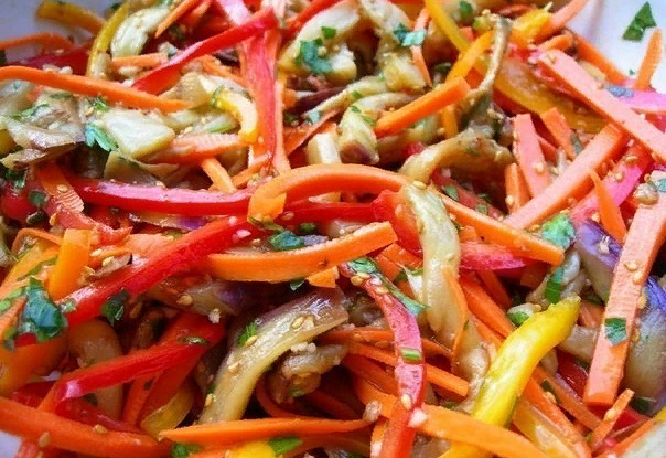 ИНГРЕДИЕНТЫ 1.Баклажаны очистить от кожуры, нарезать вдоль большими дольками и хорошо посолить. 2.Оставить минут на 30. 3.Потом хорошо отжать и пережарить их в масле. 4.Нарезать тоненько остальные овощи и перемешать с баклажанами в свежем виде. 5.Добавить чеснок и специи. 6.Можно добавить немного зелени кинзы (кто любит). 7.Полезный совет: чтобы баклажаны не брали в себя много масла — хорошо отжимайте их перед жаркой. Понравился рецепт — поделитесь им с друзьями в социальных сетях! Готовьте вместе с «Едой»!