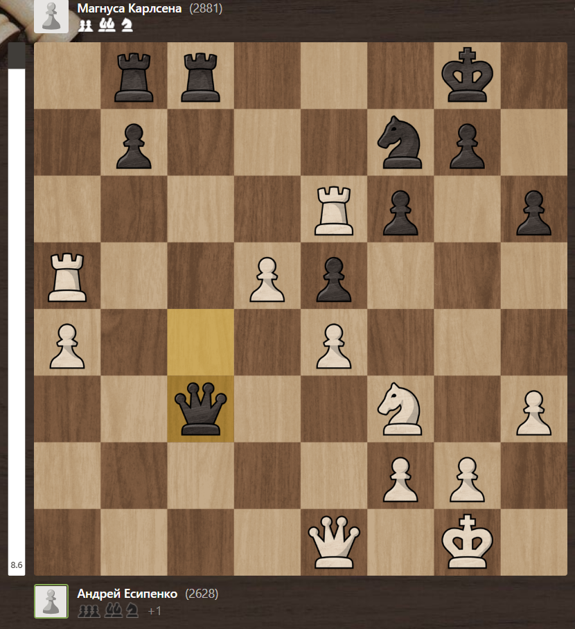 Задачка из недавно сыгранного матча Андреем Есипенко против действующего чемпиона мира Магнуса Карлсена. В этой позиции чемпион допустил чудовищную ошибку забрав пешку, но Андрей не смог найти выигрывающее продолжение...