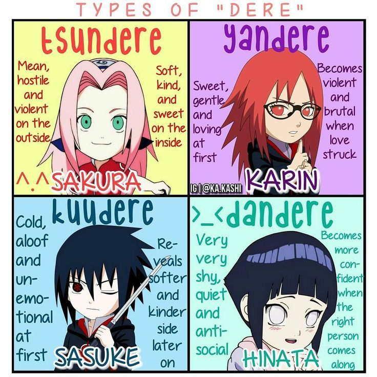 Кудере тип А - Безэмоциональные, холодные, держащиеся в стороне. Мало разговаривают, а когда все-такиговорят, то имеют тенденцию быть прямолинейными и циничными. Обязательные атрибуты - пустое лицо и ровный голос. Несмотря на свою ледяную природу, персонажи кудере вполне способны на заботу и формирование романтических уз. Чаще раскрываются хуже чем другой вид кудере. Примеры Шино Маширо или Аянами Рей Кудере тип В - Похожи на прошлый тип , но в отличии от них не имеют истинной хладнокровности , а просто образуют образ, и на самом деле такие девушки всегда переживают за объект обожания , но стараются этого не показывать. Пример Мичиру Кинушима из аниме пластиковые воспоминания. Химедере - Конкретно архетип химэдере ограничен женскими персонажами. Они хотят, чтобы к ним относились как к принцессам, даже если они не являются настоящими особами королевских кровей. Иногда это может выступать в качестве маски, чтобы скрыть неуверенность. Классический оскорбительный смех «охохо» является и