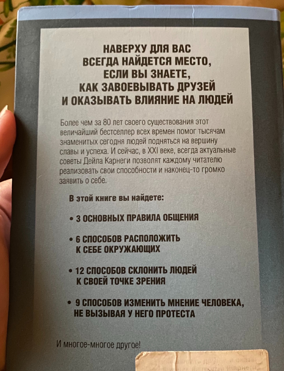 📍Это поистине прекрасная книга. 👉🏻Как минимум, потому что её автор - Дейл Карнеги - американский педагог, лектор, писатель, оратор-мотиватор. Один из самых знаменитых и популярных писателей книг о психологии. 📔Его книги продавались, продаются и будут продаваться миллионами экземпляров. 📖Книга, о которой я расскажу была куплена мною неделю назад, и уже подошла к концу. ⌛️К слову, обычно произведения в стиле нон фикшн я читаю по несколько недель, тщательно во всё вникая и выписывая. 📌После прочтения этой книги вы начнёте анализировать ситуацию и человека, и принимать определённые решения в зависимости от анализа. Вы станете своеобразным Шерлоком Холмсом. 📎Книга много рассказывает про критику, значимость и эгоизм. ⏱Я могу и дальше расписывать содержание книги, но есть ли в этом смысл, когда на обратной стороне обложки и так всё написано? 🧐Очень сложно передать все свои впечатления в виде текста. Но могу сказать одно: книга перевёрноёт ваш мозг и сознание, ваше общение нала