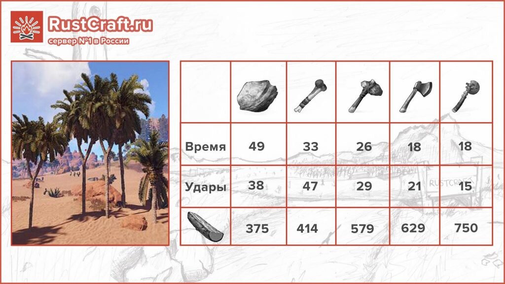 В игре Rust Experimental дерево является одним из самых важных ресурсов, который требуется для строительства. В этом гайде мы вам расскажем, как же правильно добывать дерево в игре с разных типов деревьев. Специально для этого мы подготовили материал в стиле инфографики, где на каждой картинке описали количество единиц, которое добывается с каждого дерева разными инструментами. Внимание! Все данные описаны для классических серверов по игре Rust! Если вы играете на модифицированном сервере, то для расчета узнайте рейты, которые установлены, и просто умножьте количество с картинки на множитель сервера. Что ж, поехали… Первый тип дерева — Palm (Пальма) Второй тип дерева — Snow Pine (Снежная сосна) Третий тип дерева — Field Bare tree Четвертый тип дерева — Bare Pine ( Блестящая сосна) Пятый тип дерева — Douglas Fir Шестой тип дерева — Red Maple (Красный клен) Седьмой тип дерева — Tall Snow Pine (Высокорослая снежная сосна) Восьмой тип дерева — Pine (Сосна) Теперь вы знаете, что в игре Rust