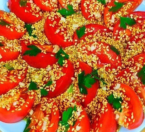 Для приготовления понадобится: Приготовление: Помидоры нарезаем на средние дольки. Выкладываем на тарелку в один слой. Это важно, так как помидоры хорошо пропитаются заправкой и каждый кусочек будет вкусным. Нарезаем мелко чеснок и равномерно распределяем его по всем помидорам. Берем немного базилика и посыпаем помидоры. На Ваш вкус вместо базилика можно взять зеленый лук, укроп или кинзу . Готовим заправку: смешиваем лимонный сок, оливковое масло, перец и соль. Посыпаем кунжутом помидоры. Заправляем равномерно помидоры заправкой и подаём к столу! На пропитку помидоров время не требуется! Приятного аппетита!
