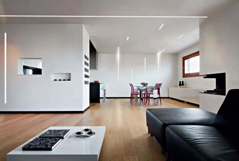 освещение потолка и пола. Подсветка пола будет эффектно смотреться в том случае, если дизайн