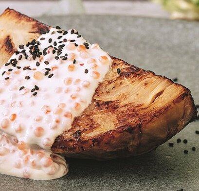 Приготовьте новое изысканное блюдо из простых ингредиентов. Идеально сбалансированный вкус этого блюда подойдёт и для обеда, и для ужина. Несмотря на простоту ингредиентов, оно одинаково хорошо смотрится и на праздничном столе, и на обычном. Нежный аромат и приятный вкус дополнят любой приём пищи. Что понадобится? Для соуса: Шаг 1. Разогрейте духовку до 180 °С. Выложите кочан на противень и запекайте 2 часа. Шаг 2. Достаньте капусту из духовки, удалите обгоревшие верхние листы и разрежьте кочан на 6 сегментов, посолите. Шаг 3. Чеснок очистите и раздавите. Разогрейте в сковороде растительное масло, добавьте сливочное и обжаривайте чеснок 1 минуту, чтобы он раскрыл аромат. Добавьте капустные дольки и обжаривайте на среднем огне по 4 минуты с каждой стороны. Шаг 4. Для соуса в другом сотейнике на маленьком огне подогрейте сливки, добавьте сыр и перемешайте, чтобы соус стал однородным. Выключите огонь и добавьте в соус икру. Шаг 5. Разложите дольки капусты по тарелкам, полейте сырно-икорны