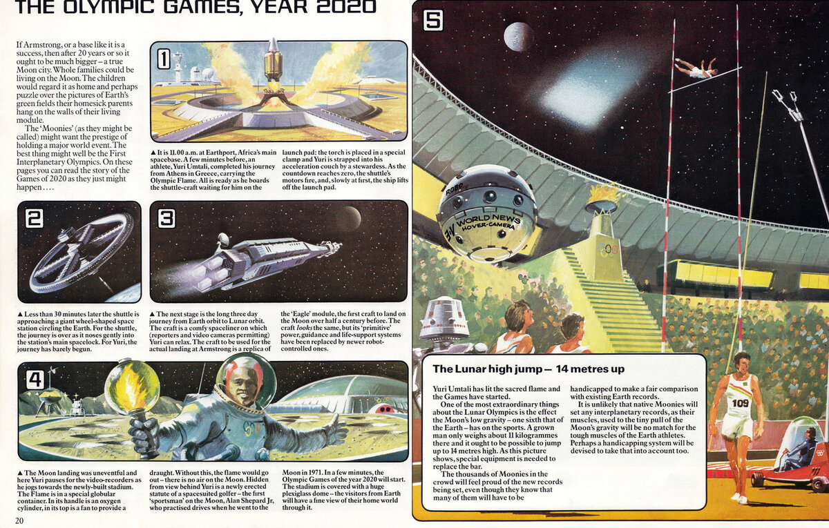 Можете представить себе, как будут проходить Олимпийские игры через 40 лет? Насколько вообще возможно предугадать место их проведения, виды спорта, включённые в список, или дизайн формы спортсменов? Подобную попытку сделали авторы книги "Города будущего: дома и жизнь в XXI веке" (Future Cities: Homes and Living into the 21st Century), вышедшей в 1979 году. Вдохновлённые успехами техники и темпом исследования космоса, футурологи и художники создали смелое видение, которое больше рассказывает не об Олимпиаде-2020, а о периоде, отделяющем нас от года, когда был сделан прогноз. События Олимпиады-2020 занимают один разворот книги и повествуют о необыкновенном спортивном событии, с которым нам, жителям 2021 года, трудно себя ассоциировать. Что же предсказывали авторы? Если лунная база будет успешной, то лет через 20 она может разрастить до настоящего города. На Луне смогут жить целые семьи, и их дети наверняка будут недоумевать от фотографий зелёной Земли, развешенных по стенам жилых модулей