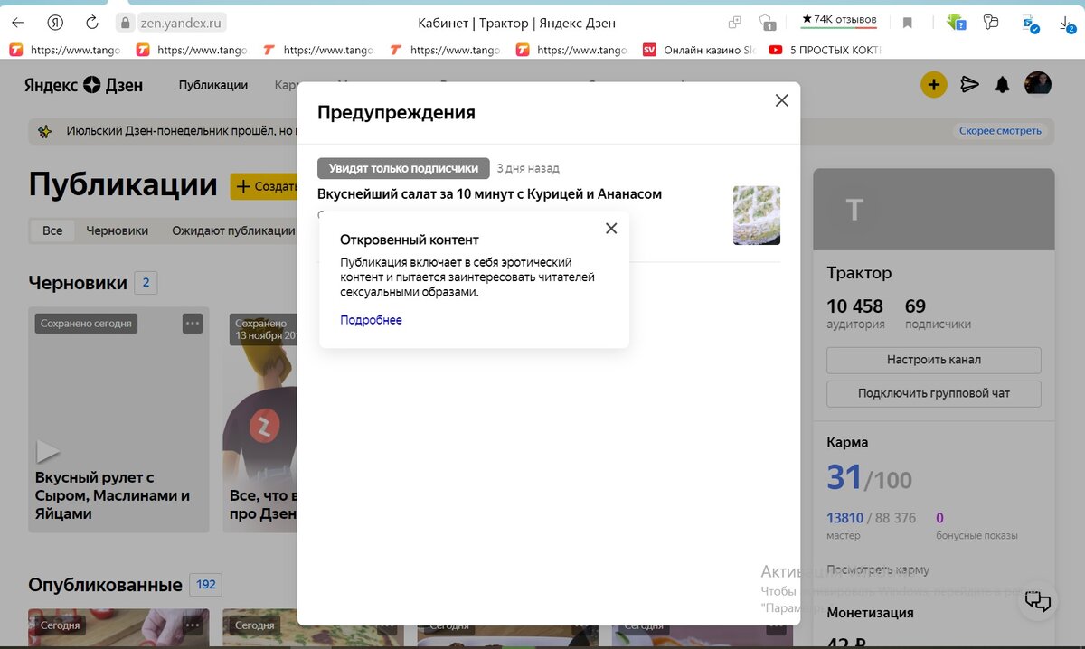 Всем привет ребята! Хочу поделиться с вами своим неприятным случаем при работе на дзен. 3 дня назад я выложил видео рецепта вкусного салата с Курицей и Ананасом. Видео можете посмотреть у меня в профиле. Публикация не набирала просмотры в течении 3 дней. Я не придал этому значения и продолжал выкладывать новые ролики на свой канал. Но сегодня когда я в очередной раз загружал видео ролик. Дзен затупил и не хотел обрабатывать мое видео. Тогда я решил нажать на Кнопку предупреждение. И как вы думаете что я там увидел? А вот что ! Я не понимаю как можно было додуматься модераторам поставить контент 18+ на простой рецепт салата. Алоооо Дзен прием! Как слышно? Было принято решение написать в поддержку. посмотрим как они на это отреагируют. У кого были похожие ситуации? Делитесь в комментариях!