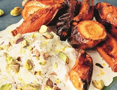 Запечённая морковь, обжаренная в кленовом сиропе, с фисташково-йогуртовым соусом