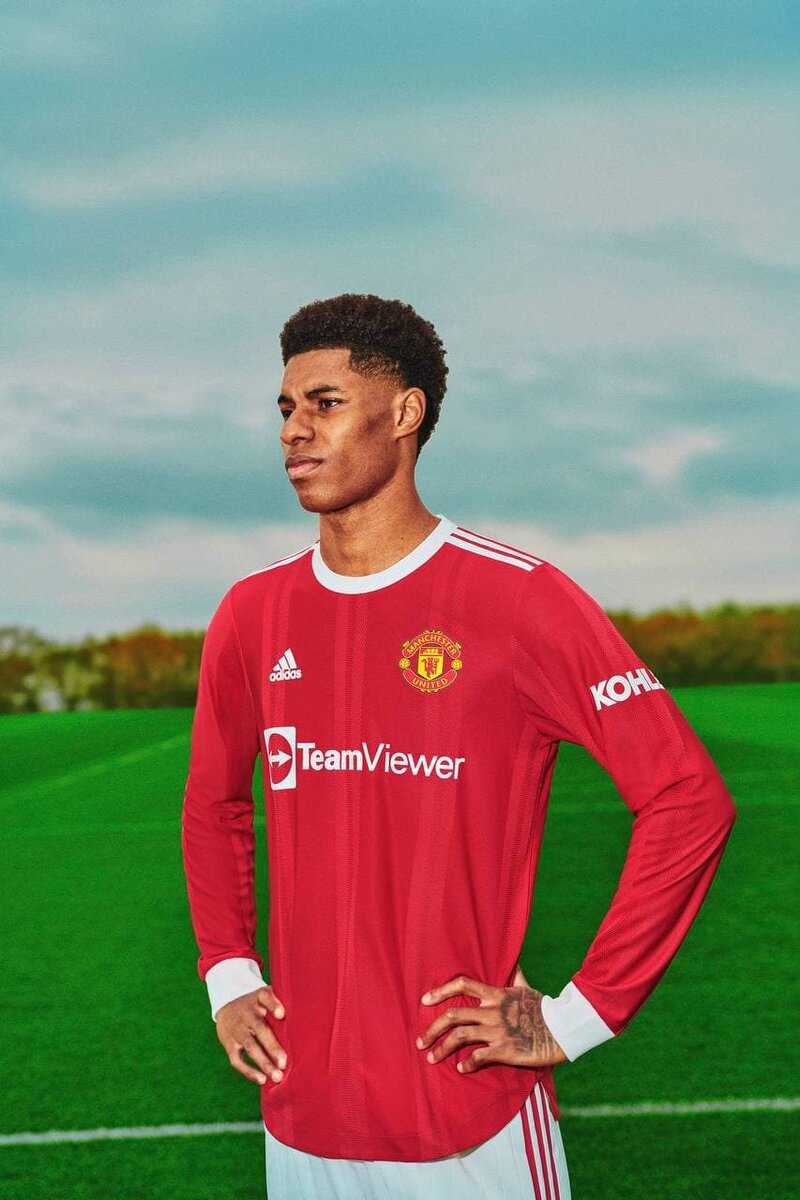 Домашняя форма МЮ 21/22 выполнена в красном цвете с белым округлым воротником, белыми полосками на плечах и белыми манжетами. Эмблема Chevrolet сменилась на логотип компании Team Viewer. На внутренней стороне воротника расположена бежевая линия с текстом Youth. Courage. Success.