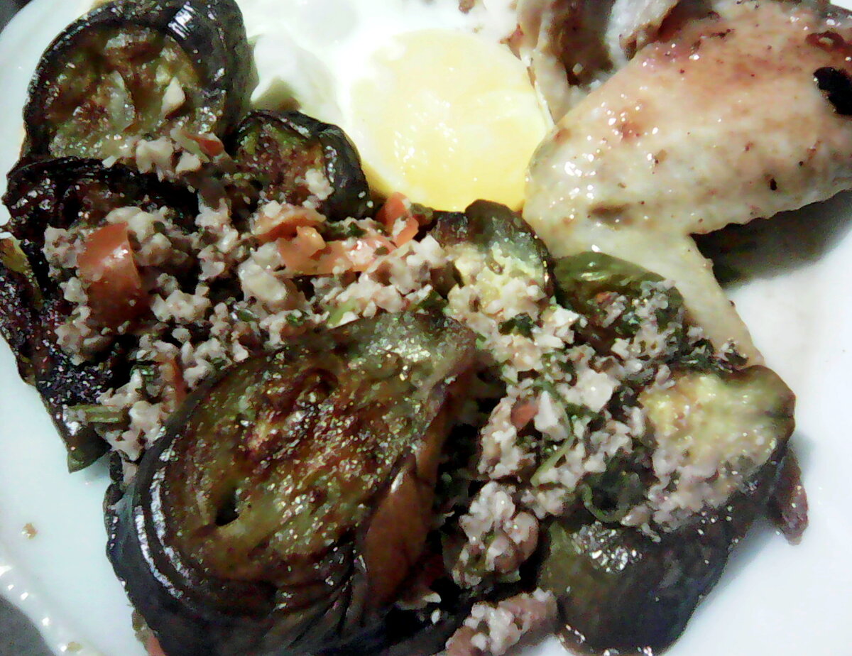 Горячие баклажаны выкладываю на блюдо и поливаю ореховым соусом.