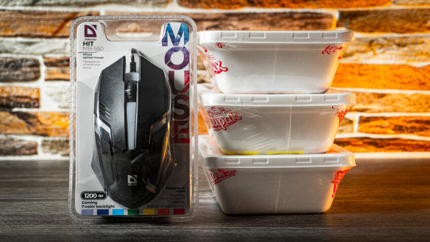 Сегодня у нас необычный тест: мы купили самую дёшевую мышку со словом Gaming в названии. Никакого анализа или подбора не делали — открыли сайт ближайшего магазина (nix.ru), отфильтровали по цене, записали артикул и двинули за покупкой. Домой вернулись с Defender HIT MB-550 за 150 рублей (120 на момент покупки) и тремя пачками «Доширака». Сейчас расскажем, что лучше. Внешний вид Удивительно, но при такой цене мышь продаётся не в пакетике из-под хлеба, а в нормальном блистере с цветной подложкой внутри, на которой как раз и написано, что мышку мы купили не простую, а Gaming — с «рифлёным колесом прокрутки» и аж семью цветами подсветки. Собственно, на этой картонке комплектация почти и заканчивается. Внутри есть ещё только инструкция, в которой написано, какой стороной втыкать провод. Открывая блистер, мы были уверены, что вонь пластика собьёт нас с ног. К счастью, всё оказалось не так. Воняет, конечно, порядочно — ядрёная смесь подожжённой пластмассы и какой-то краски, — но для того, что