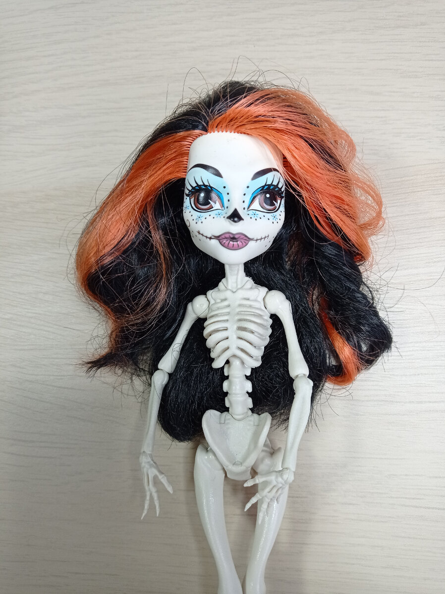 Всем привет! Меня зовут Александра, и я увлекаюсь преображением (ООАКом) кукол Monster High и Ever After High. Несколько дней назад я начала переделывать Скелиту Монстер Хай в дух воительницы. О начале проекта можно почитать тут. Автор этого проекта мой сын. А саму куклу для переделки ему подарила моя подруга Маша. Вот такая куколка была до переделки. Для того, чтобы лицо Скелиты стало более скелетным, мне пришлось его знатно подпилить. И сегодня я начала роспись лица. Задача - сделать максимально страшно. И чтобы у глаз был эффект синего свечения. Первый слой. Прорисовала основные элементы черепа, сделала сине-черные глазницы. Это первая кукла, где роспись, почти, полностью делала сухой пастелью. На втором слое добавила трещин, сделала тон черепа и сделала зубы ярче. На третьем слое добавляла, в основном, яркости. Четвёртый слой - чтобы у глаз создать эффект свечения, вокруг глазниц нанесла немного синего цвета. И слегка высветлила синюю часть глаз. Закрепила роспись клиро