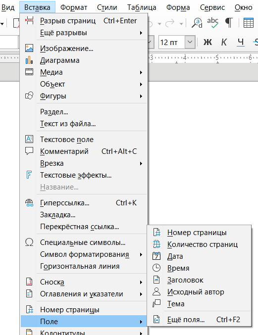 В Writer работа с полями осуществляется прежде всего при помощи диалогового окна «Поля», которое вызывается через меню «Вставка» → «Поле»: