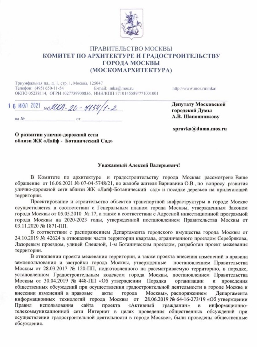 Действительно, недавно по проекту внесения изменений в правила землепользования и застройки касательно данной территории были проведены общественные обсуждения. Однако из ответа Москомархитектуры следует, что планов по строительству сквозного проезда и дороги нет! Более того, в соответствии с проектом межевания территории указанный в обращении земельный участок определен как общественная территория, которая не закреплена красными линиями улично-дорожной сети.