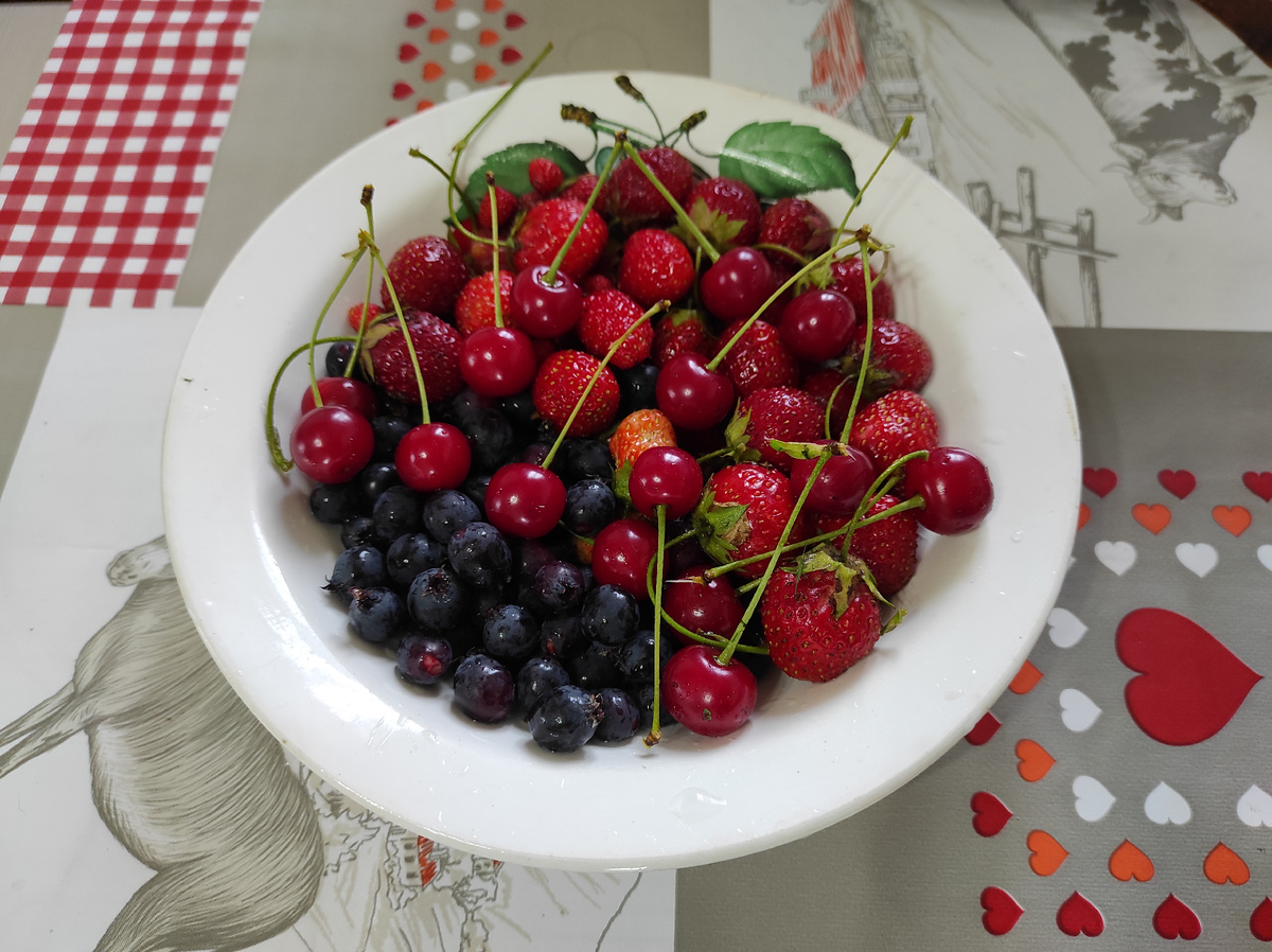 Устали мы вчера с дороги, да ещё гуляли до сна и вечером уснули очень быстро, зато утром Дима подскочил в 8 утра. Ну хоть в 8, а то ведь в начале лета он просыпался в 6:30-7:00. Вообще, в этом есть и плюсы: в школу, например, мне даже не приходится его будить, как только звенит будильник у меня и я встаю, так и Дима сразу сонным голосом: - Мам, налей йогурт. Посидели позавтракали с родителями и пошла я на осмотр владений в поисках чего-нибудь вкусненького. Мой улов)). Дима ягоды не ест, а вот я очень люблю, жаль ещё крыжовник не вырос. Только в этом году кустики посадили. А ваши дети едят ягоды? Я помню мы всё детство в деревне наедались за лето, то черемуху где-нибудь найдём крупную, сладкую, потом весь рот чёрный правда 😁. И ведь ели всё "с куста", ничего не мыли, максимум в бочке грязь смоешь дождевой водой и всё на том, это сейчас всё по-другому. В лесу за забором растёт земляника, мелкая, но очень сладкая, раньше и морошки очень много было на болоте, уже давно её не стало, я