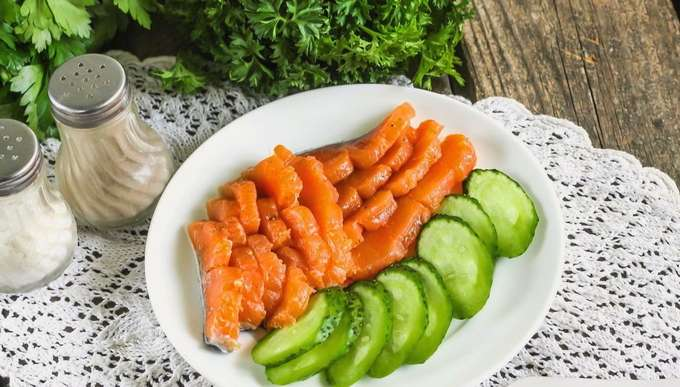 Для яркого и интересного украшения вашего стола попробуйте приготовить тарталетки с красной рыбой. Простая в исполнении закуска порадует своим нежным вкусом. Гости будут в восторге! Ингредиенты: Тарталетки вафельные – 6 шт. Рыба красная – 120 гр. Огурец – 2 шт. Сметана – 4 ст.л. Зелень – для украшения. Перец черный молотый – по вкусу. Соль – по вкусу. Процесс приготовления: 1. Красную рыбу разделываем на тонкие и длинные кусочки. Огурцы моем и нарезаем продолговатыми кружочками. 2. В вафельные тарталетки равномерно распределяем сметану. К ней можно добавить немного соли и черного молотого перца. 3. В каждую тарталетку со сметаной вставляем по кусочку огурцу. 4. Скручиваем кусочки красной рыбы и размешаем им по тарталеткам. Огурец должен остаться в вертикальном положении. 5. Дополняем закуску небольшими веточками ароматной зелени и подаем к столу. Готово! Приятного аппетита!