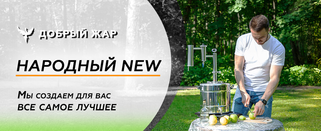 Сегодня третья серия нашего обзора новых самогонных аппаратов. После общего анонса и подробного разбора аппарата «Сириус NEW» мы переходим к аппарату «Народный NEW». Забегая вперёд, отметим, что он претерпел больше всех изменений среди новинок, поэтому присаживайтесь поудобнее. Начнём с перечня изменений: · Увеличение производительности холодильника на 30% · Голова аппарата крепится на кламповом соединении · Сухопарник обновился до джин-корзины · Электронный термометр вместо биметаллического · Клапан сброса давления на крышке куба · Мини-дефлегматор перед джин-корзиной Холодильник Пожалуй, главное улучшение аппарата. Его размер увеличился на 30%. Соответственно, вслед за этим вырастает и скорость, и качество очистки. Скорость перегонки составит 3 л/час. Кламповое соединение Модернизация аппарата – целая площадка для экспериментов. Народный NEW не отстаёт от аппаратов колонного типа и готов посоревноваться с ними. Мини-царга, дополненная кламповым соединением на 1.5 дюйма, позволит вам