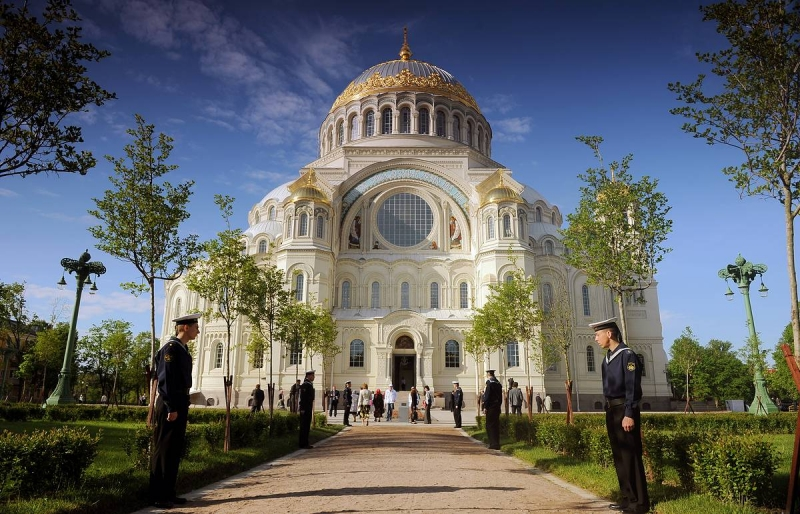 В июле 2005 года мы посетили морскую крепость - Кронштадт. Это небольшой город, расположенный на острове Котлин в Финском заливе, недалеко от Петербурга. Чтобы добраться до него, нужно проехать по дамбе, которая соединяет остров с Петербургом. Дорога очень живописна - по обочинам плещутся воды Финского залива, кричат чайки, светит солнце и отражается бликами на зданиях города. Кронштадт был заложен Петром I, чтобы оберегать вход в Неву и не пускать врагов по воде в Петербург. За свою историю Кронштадт ни разу не пропустил неприятельские корабли, зорко охраняя покой Балтики. В центре города на Якорной площади возвышается Морской собор. Он имеет очень важное значение для Кронштадта. Одна половина населения города связана со службой на флоте, а другая половина - с судовыми верфями и портом. На стенах храма находятся мемориальные доски с именами тех, кто отдал свою жизнь защищая Отечество на море. Интересной особенностью площади является единственная в мире чугунная мостовая. Её проложили
