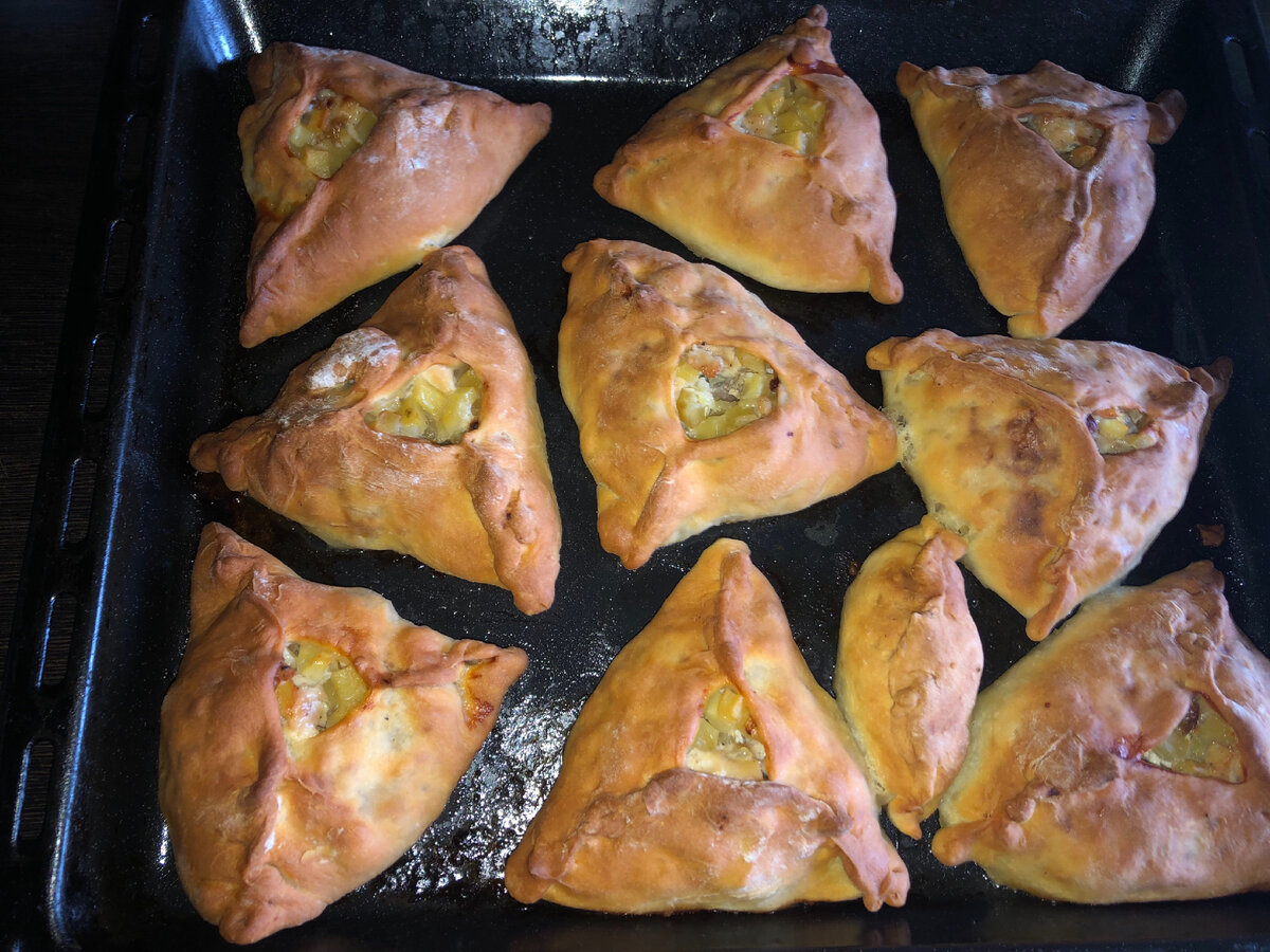 Любит моя доча треугольники и всякие пирожки, иногда готовлю ей. Сегодня решили сделать треугольники из куриного филе и уточки, получилось очень вкусно. Тесто я обычно делаю по такому рецепту: Все это хорошо замешиваем,накрываем полотенцем и убираем в тёплое место, я поднимаю тесто несколько раз. Пропорции меняем в зависимости от желаемого колличества выпечки. Для начинки я взяла: Так как пропорции на тесто и на начинку у меня сегодня были значительно больше нормы я приготовила ещё и пирог. Приготовила много, хватит что бы и соседей угостить) Помогала в готовке ещё и дочка, даже сама слепила себе пирожок Конечно к треугольникам я приготовила ещё и куриный бульон😊