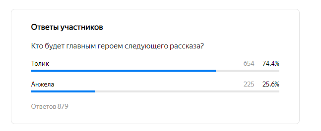 Пришло время подводить итоги. Думаю, что все, кто хотел оставить свой голос, уже это сделал. Голосование проходило как на канале, так и в группе в ВК. Результаты получились вполне ожидаемыми: по комментариям уже всё было понятно. Именно так выглядит итог голосования на Дзене. А это уже скрин из группы в ВК. Результат однозначный: с большим отрывом побеждает Толик! Все это время время я обдумывала сюжет новой книги. И, честно, нет ни одной идеи. Представляете? Картинки за картинками в голове всплывают, но это скорее отдельные сценки-зарисовки, чем что-то цельное. Но я продолжаю думать, надеясь на вдохновение. Сложность еще заключается и в том, что сейчас я работаю без выходных, а заканчивается рабочая смена дикой головной болью, что выводит из строя на оставшееся свободное время. Обещаю, в ближайшее время опубликую первую главу. Скорее всего она будет небольшая, так что прошу заранее прощения. А пока предлагаю вам почитать на Литнет замечательную книгу, которую я сама читала с прев