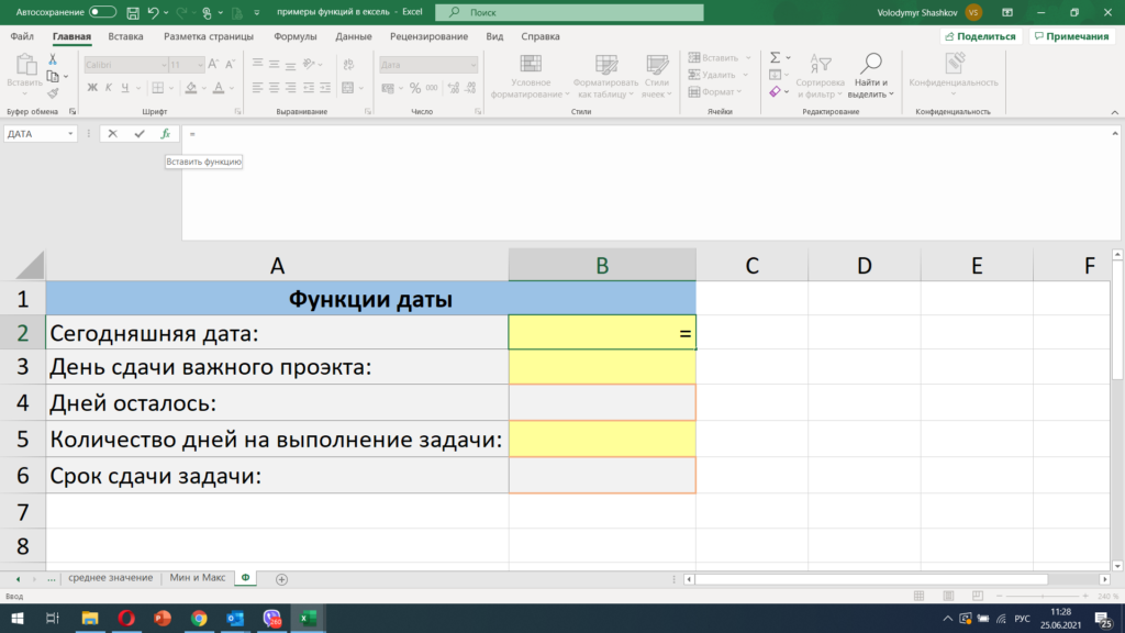 В данной статье мы рассмотрим как можно прописать формулу сегодняшнего дня , а также другие функции работы с датами. А именно разберем на примерах как использовать функцию сегодня, а также как вычитать и складывать, эти даты. Формула СЕГОДНЯ позволяет автоматически менять дату каждый день и если скажем вам нужно понимать сколько вам осталось дней до определенного проекта, даты то excel вам будет выдавать данную информацию в автоматическом режиме. Кого интересуют и другие функции, оставляю ссылку на урок формула среднего значения в excel. Ну и как всегда в начале добавляю ссылку на видео-формат данного урока: Формула сегодня в excel примеры написания и применения 2. В левом углу под меню выбираем fx функцию СЕГОДНЯ, если ее нет в перечне ищем через поиск выбираем и нажимаем ок; 3. Откроется окно , аргументы функции, в данном случае без ввода аргументов жмем ENTER; 4. После чего в ячейке пропишется формула сегодня и отобразится сегодняшняя дата, которая будет автоматически меняться в з