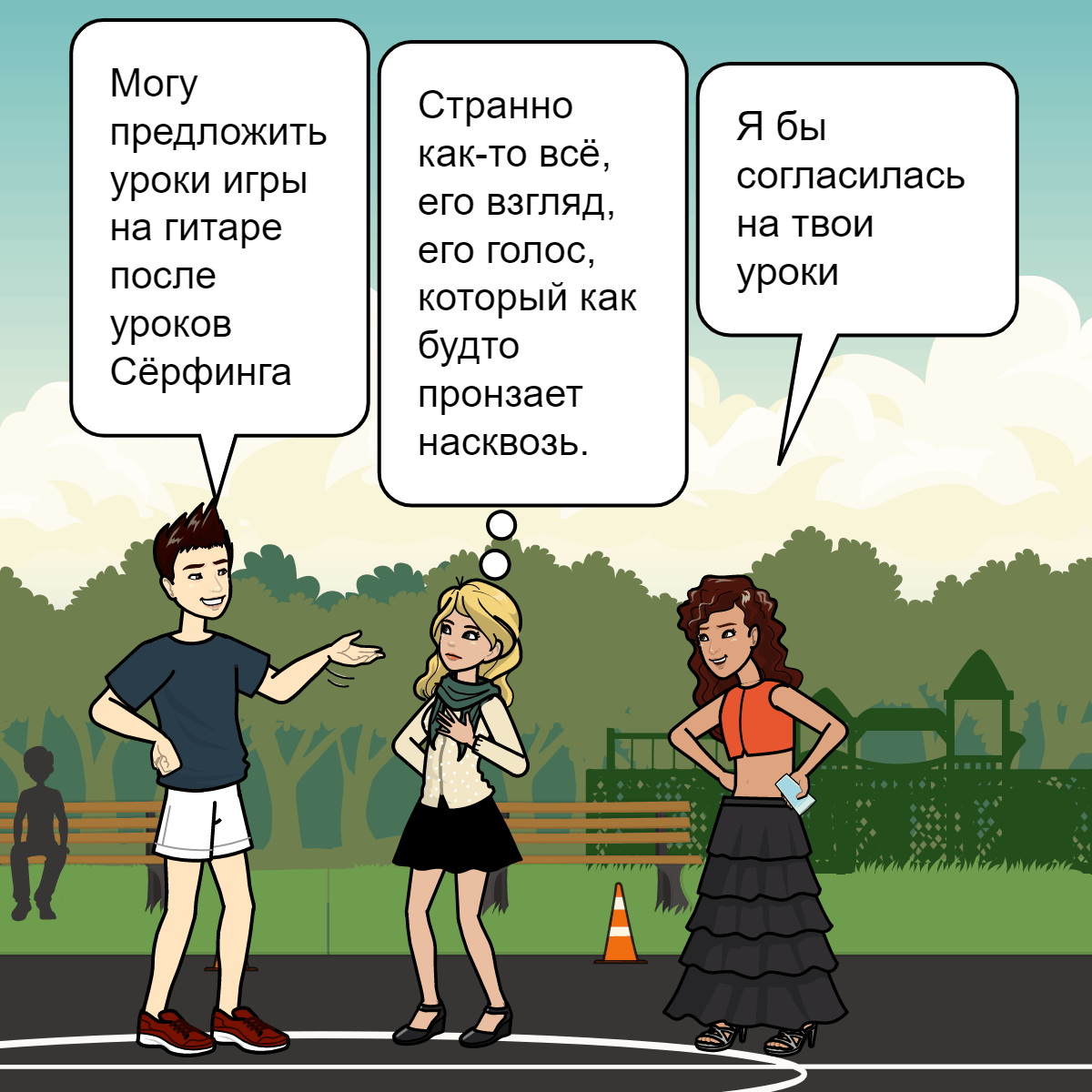Ксюша смотрела на них с лавочки и немного нервничала. Зачем она пришла сюда вообще (Марина) и где сейчас её парень? Тем более он у неё такой грозный. Видел бы он как они тут напевали, быстро бы разобрался. Ксюше хотелось встать и подойти к ним, но она пока что была никто для Володи, даже не его девушка, и любые действия показались бы странными, да и не хотелось, чтоб Володя подумал, что она на него вешается. Поэтому она сидела на лавочке и наблюдала. «В конце концов, эта блондинка мне даже в подмётки не годится»-решила для себя Ксюша.