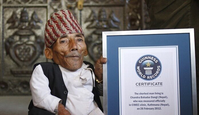 1 место: Чандра Бахадур Данги — 54,6 см Это не только самый маленький человек в мире, но и самый худой мужчина. При своём небольшом росте он весил всего 12 килограммов, страдая от врожденной карликовости. До того, как попасть в Книгу рекордов Гиннеса Чандра никогда не покидал свою родную деревню в Непале. Он использовал свой новообретенный статус самого короткого в мире человека, чтобы путешествовать по миру и привлекать внимание к родной стране. В 2015 году Чандра скончался. 2 место: Гуль Мохаммед — 57 см Этот низкорослый мужчина был родом из Нью-Дели, Индия. Он родился в 1957 году и умер в возрасте сорока лет от респираторных проблем со здоровьем. Все эти проблемы были связаны с продолжительным периодом тяжелого курения. 3 место: Джунри Балуинг - 59.9 см Этот молодой филиппинец, входящий в тройку самых низких мужчин на планете, прекратил расти через несколько месяцев после своего рождения, в 1993 году. Джунри страдает от ряда проблем со здоровьем, в том числе слабых коленей и боле