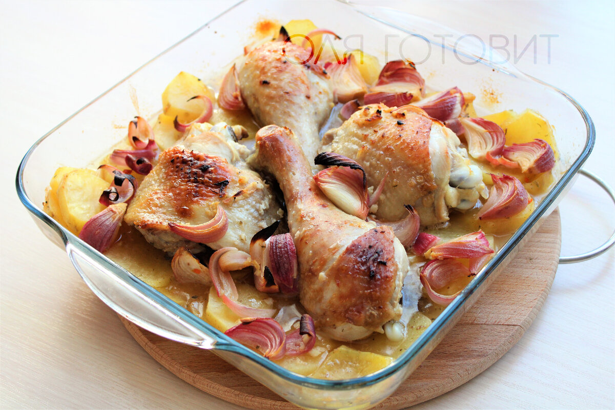 Сегодня хочу напомнить рецепт очень вкусного маринада, который любое мясо сделает сочным, мягким и вкусным. Частенько готовлю в таком маринаде домашнюю курочку, она более жесткая, чем та, которая продается в магазине. Если вы еще никогда не готовили мясо в таком маринаде, то очень рекомендую попробовать. Сегодня для приготовления я использую два бедра и две голени домашней птицы, общий вес которых примерно 900 грамм. Обязательно запекаю курицу с луком, без него будет совершенно не то, чего хотелось бы добиться. Лук нужно нарезать полукольцами, или как я, довольно толстыми перышками. Теперь нужно приготовить маринад, это занимает буквально несколько секунд. В одной емкости смешиваем 5-6 столовых ложек растительного масла без запаха, 2-3 столовые ложки лимонного сока, 1 столовую ложку острой горчицы, выдавленный через пресс чеснок (от 3 до 6 штук) и, конечно, соль и перец. Все обязательно хорошо перемешиваю и отправляю к курице с лу