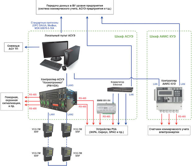 Пример построения АСУ ТП ПС (КРУ, РУ, КТП) представлен на рис. 1. Показано взаимодействие сразу нескольких систем: АСУЭ, АИИС КУЭ, РЗА, пожарной и охранной сигнализации.