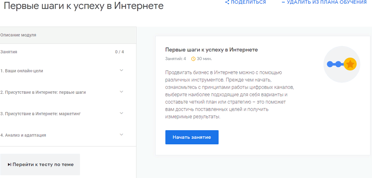 Для начала я изучил первую тему "Преимущества вывода бизнеса в Интернет" Далее я начал изучать тему Первые шаги к успеху в Интернете И я узнал из нее, что сначала нужно определить онлайн-цели, пусть даже крохотные, расставить приоритеты. К примеру, у вас есть своя парикмахерская, вам нужно больше клиентов, для этого есть интернет. Создать сайт, украсить под свою тематику, придумать название вашей компании, указать адрес, используя удобные инструменты. Выполняю задание Занятие успешно завершено! Для продвижения бизнеса в интернете вовсе не обязательно создавать сайт. Можно просто указать свой бизнес в Google.Мой бизнес и он будет появляться при запросе темы вашего бизнеса в поисковике, либо же создать аккаунт в соц.сетях и разместить информацию о вашем бизнесе Прохожу задание Я прошел тему, дальше Это очень полезное видео, для тех кто хочет развивать бизнес Выполняю задание Прошел эту тему и иду на следующую! Выполняю задание Я прошел все 4 занятия Спасибо, что были со мной