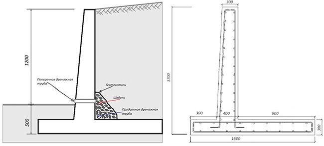 Если уклон поверхности вашего участка не слишком большой, то изготовить своими руками подпорную стенку из бетона будет не сложно. Для примера: вам необходимо построить подпорную стену высотой 1,2м (над уровнем почвы). В целях экономии строительного материала (арматурного прутка и бетонного раствора) рекомендуем выбрать тонкостенную уголковую подпорную стену с Т-образным основанием. Как сделать подпорную стену из бетона (три основных этапа):