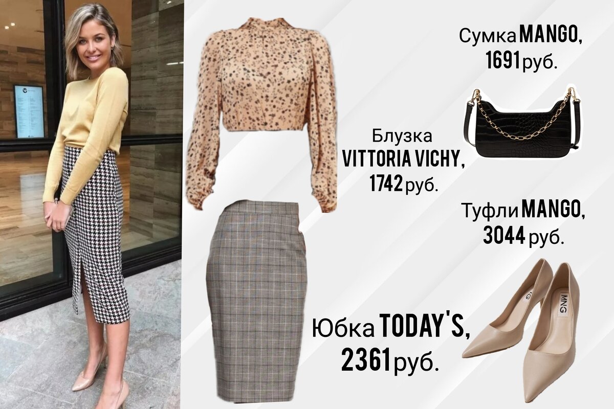 Очень понравилось сочетание черно-белой юбки и бежевой блузки тёплого цвета, поэтому подобрала аналогичный образ на Wildberries 🫐. Общая стоимость получилась 8800 рублей... Теперь давайте посмотрим подробнее каждый элемент образа: Ссылки на карточки товара сайта WB: юбка, блузка, туфли, сумка.