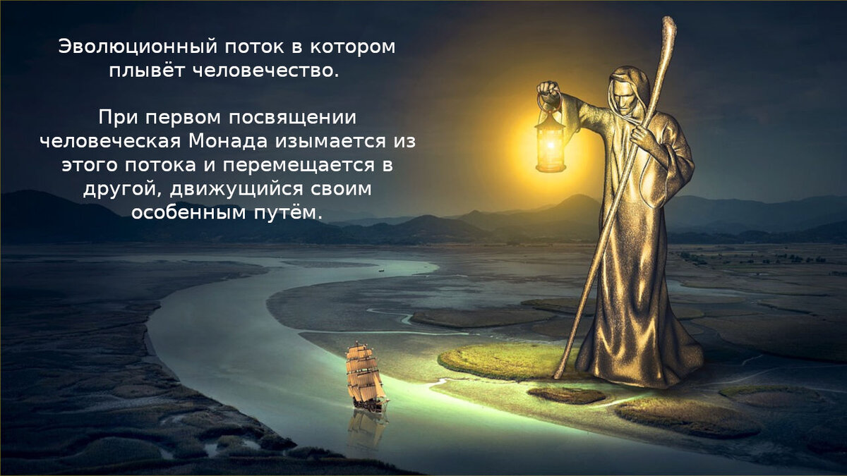 Во вторых, церемония первого посвящения является фундаментальной в жизни человека, так как с этого момента данная человеческая Монада изымается из «общего потока» несущего всех людей и переноситься в отдельный «эволюционный поток» Белого Братства. Теперь такой человек формально движется особым эволюционным путём, а не тем по которому плывёт всё остальное человечество. Такой ученик должен за несколько столетий или тысячелетий пройти курс саморазвития, который обычные люди пройдут не сильно напрягаясь в течение многих сот миллионов лет да ещё и на разных планетах.