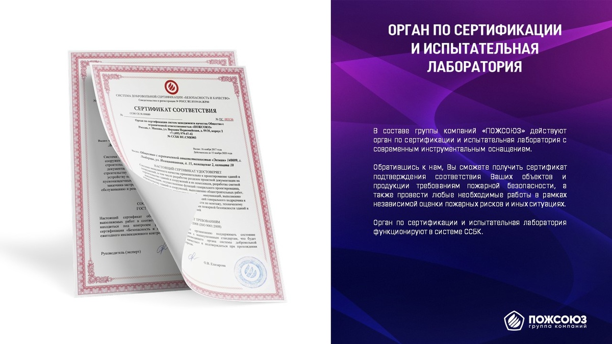 В этой связи специалистами ГК ПожСоюз была разработана собственная система добровольной сертификации «Безопасность и Качество».