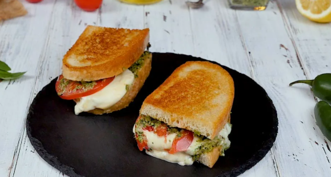3. На поджаренные тосты выложить тонко нарезанные помидоры, порванную на кусочки моцареллу.