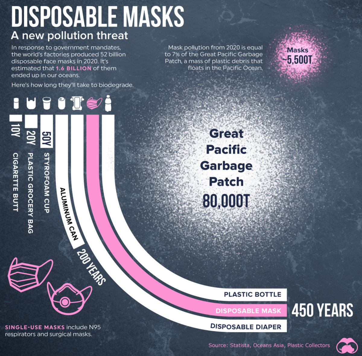 На фоне пандемии и повсеместного введения масочного режима производство одноразовых масок резко выросло - за 2020 год по всему миру было произведено примерно 52 миллиарда масок. И немалая их часть - по оценкам, порядка 1.6 миллиарда штук - закончила свою жизнь где-то в мировом океане Для сравнения: великое тихоокеанское мусорное пятно весит порядка 80 тысяч тонн, а 1.6 миллиарда масок - 5.5 тысяч тонн. Так что из одних лишь плавающих в океане масок можно собрать достаточно заметный такой мусорный островок Другая проблема заключается в том, что маски очень долго разлагаются в природе - порядка 450 лет (как и бутылки и подгузники, к примеру). Для сравнения: сигаретных пачек на это уходит всего 10 лет, а у пластиковых пакетов (с которыми весь мир так старательно борется) - 20 лет