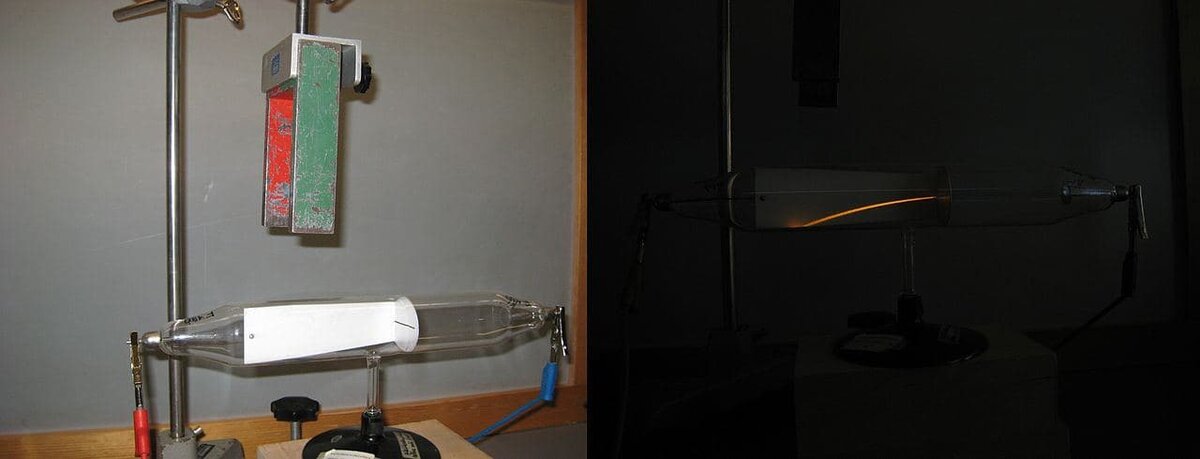 На фото экспериментальная установка для демонстрации силы Лоренца. Левое изображение: как она выглядит Справа: эффект силы Лоренца. Электрон летит с правого конца на левый. Магнитная сила пересекает траекторию полета и отклоняет электронный луч вниз. Так как электрический ток представляет собой упорядоченное движение зарядов, то действие магнитного поля на проводник с током есть результат его действия на отдельные движущиеся заряды. Силу, действующую со стороны магнитного поля на движущиеся в нем заряды, называют силой Лоренца. Сила Лоренца определяется соотношением: Fл = q·V·B·sina где q - величина движущегося заряда; V - модуль его скорости; B - модуль вектора индукции магнитного поля; a - угол между вектором скорости заряда и вектором магнитной индукции. Обратите внимание, что сила Лоренца перпендикулярна скорости и поэтому она не совершает работы, не изменяет модуль скорости заряда и его кинетической энергии. Но направление скорости изменяется непрерывно