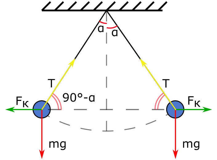 Формулировка задачи: Два одинаковых проводящих шарика, масса которых равна m1 = m2 = 0,01 г, подвешены в одной точке на нитях длиной l = 1 м. Один из шариков отвели в сторону и сообщили ему заряд q, затем привели в соприкосновение с другим шариком, после чего шарики разошлись на расстояние r = 14 см. Определите модуль заряда q. Решение: Начнем решение задачи с обсуждения вопроса о том, почему после соприкосновения шары разошлись на некоторое расстояние r. Как следует из соображений симметрии (шары одинаковые), после соприкосновения заряженного шара с незаряженным электрический заряд q равномерно распределится между шарами, т. е. каждый из них будет иметь заряд q/2. Теперь шары заряжены, и между ними возникает сила Кулона. А так как они имею заряд одноименного знака, сила Кулона будет отталкивать их друг от друга. Следующий этап - это обсуждение всех сил, действующих на тела в данной задаче. На каждый из шаров будет действовать три силы: сила тяжести mg (гравитационное поле Земли прит